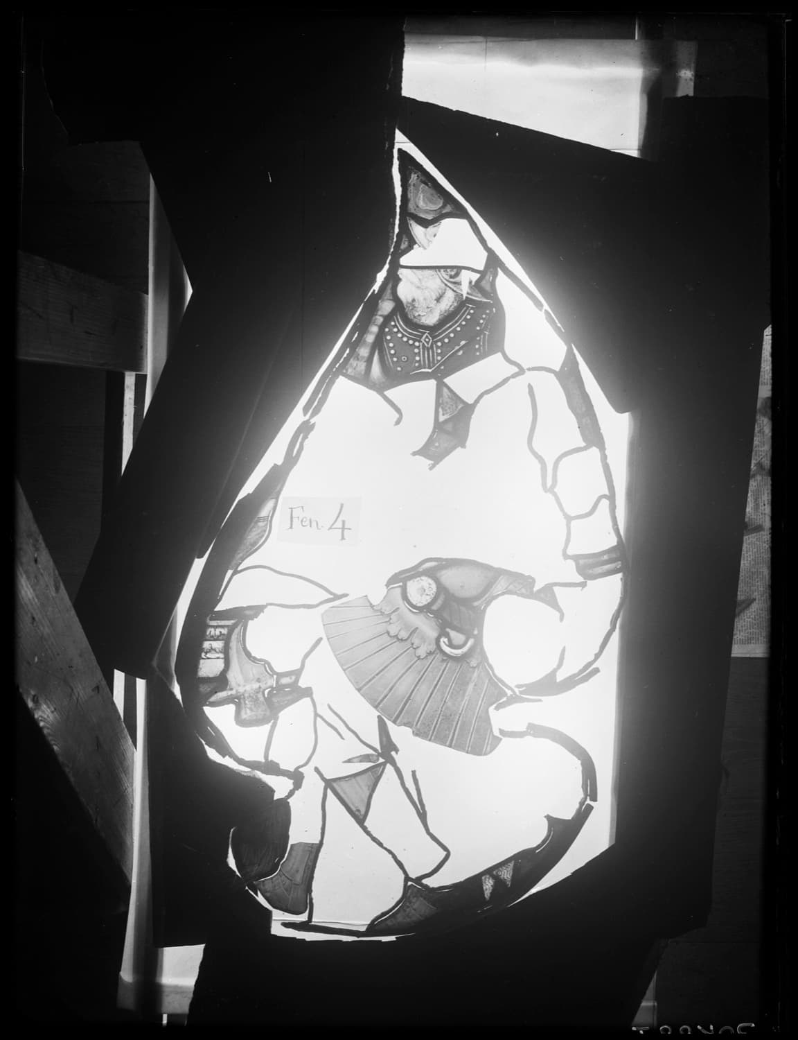 Fragments de vitraux restaurés par le peintre verrier Jacques Bony et réemployé dans l’actuelle baie 19