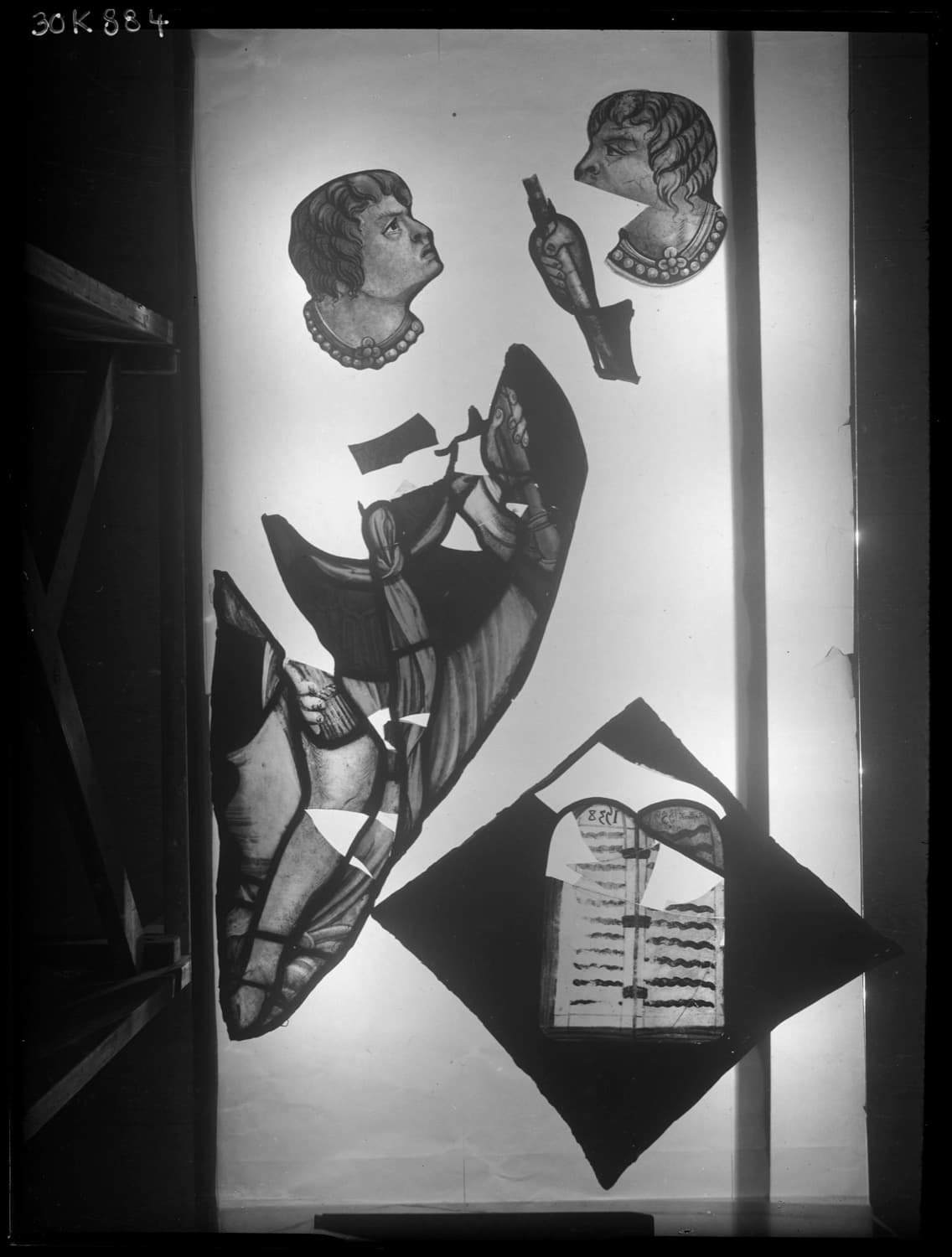 Fragments de vitraux restaurés par le peintre verrier Jacques Bony et réemployé dans l’actuelle baie 19