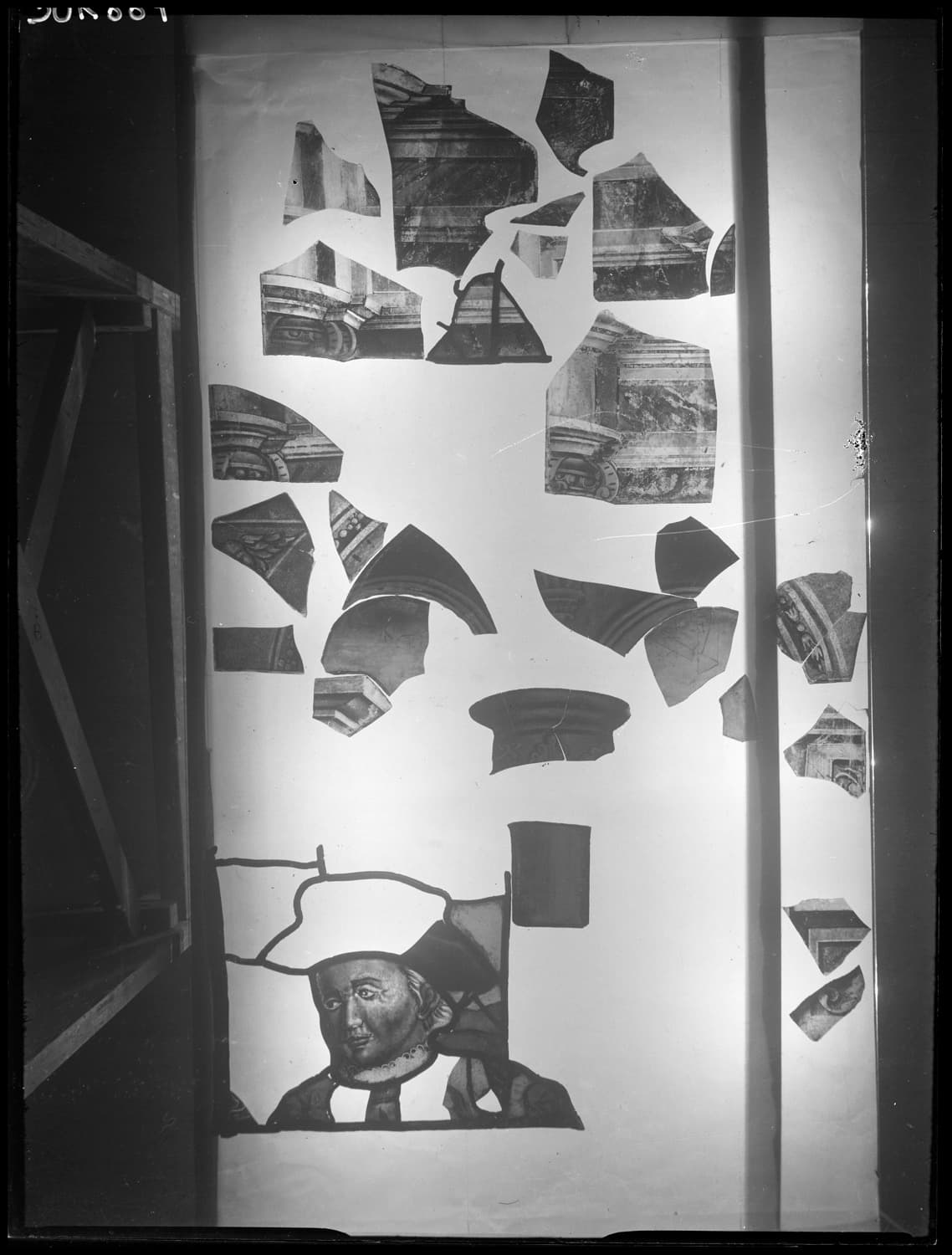 Fragments de vitraux restaurés par le peintre verrier Jacques Bony et réemployé dans l’actuelle baie 19