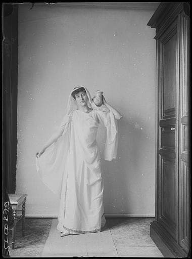 Portraits de Marcelle ou Suzanne en costume péplum : débout, de face, portant un vase sur une épaule
