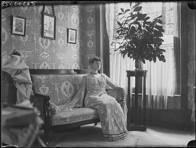 POP | Plateforme ouverte du patrimoineScène de genre, intérieur, salon : jeune femme en robe de style Empire assise sur un canapé, de face, composition de feuillages sur une table haute, vers la fenêtre