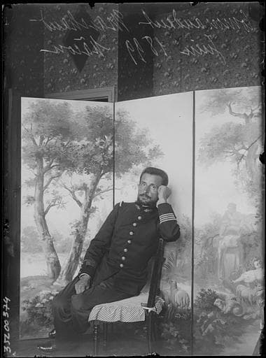 Intérieur : portrait du Commandant Marchand assis accoudé au dossier d'une chaise devant un paravent peint (scène bucolique), une main sur la cuisse