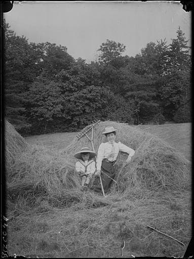 POP | Plateforme ouverte du patrimoineScène de campagne, champ : femme et garçon assis dans une meule, un râteau à foin dans les mains