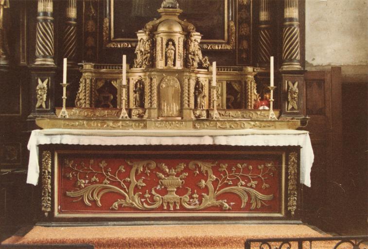 Tabernacle architecturé à deux niveaux, agrémenté des statuettes et de deux saints évêques, et de deux reliquaires placés sur les côtés, bois sculpté, doré