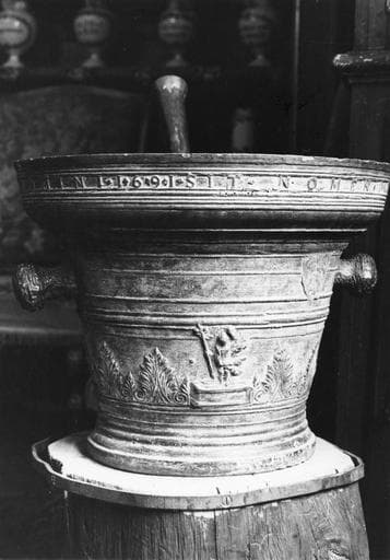 Mortier orné d'un petit relief représentant le Bon Pasteur (?), d'une frise de palmettes et d'une inscription portant la date 1691, bronze