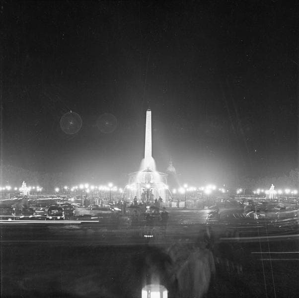 [La place de la Concorde avec ses fontaines, l'Hôtel Crillon, l'Hôtel de la Marine et l'Obélisque de Louqsor, de nuit ; passants et automobiles en mouvement]