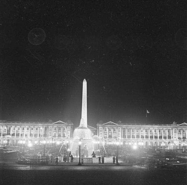 [La place de la Concorde avec ses fontaines et l'obélisque de Louqsor, de nuit]