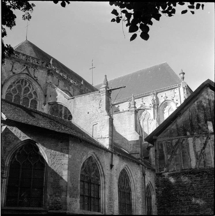 Chevet et arcs-boutants ; pignon de la maison à pans de bois accolée