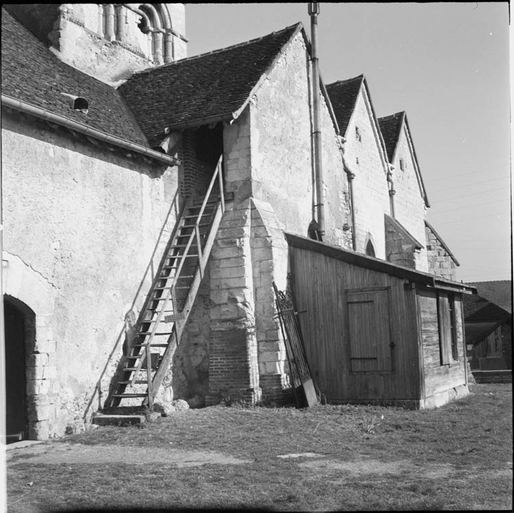 POP | Plateforme ouverte du patrimoineFaçade latérale : pignons ; construction de planches accolée à la façade et échelle de meunier accédant aux parties hautes