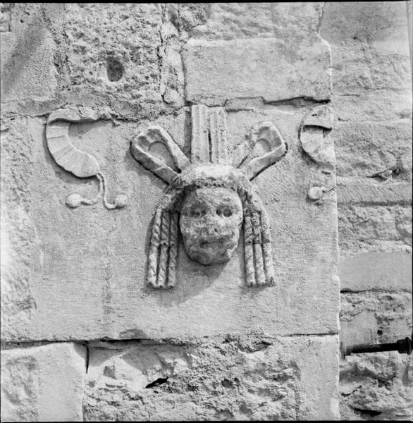 Pierre sculptée : Masque théâtral ou funéraire, réemploi