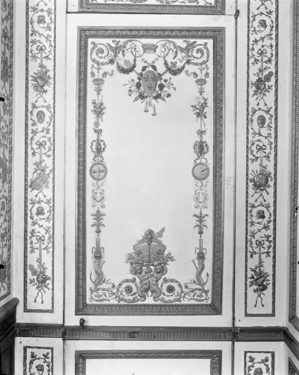 Garde-robe ou cabinet de toilette du roi Louis XVI : boiseries sculptées et dorées, détail d’un panneau
