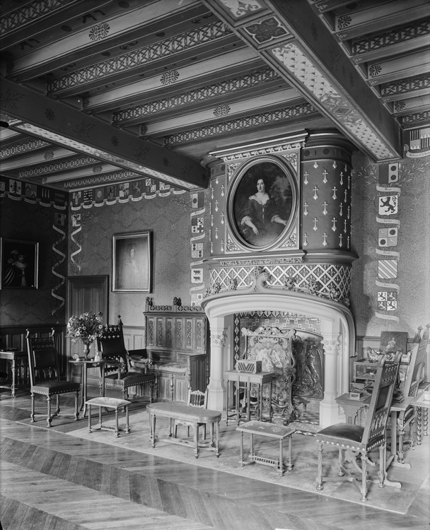 Premier étage, salon des armoiries : cheminée Renaissance et plafond peint