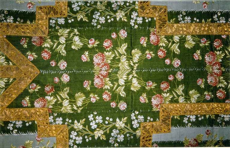 ornement vert, taffetas de soie broché, fin 18e siècle, détail du motif de la chasuble ornée de fleurs rouges