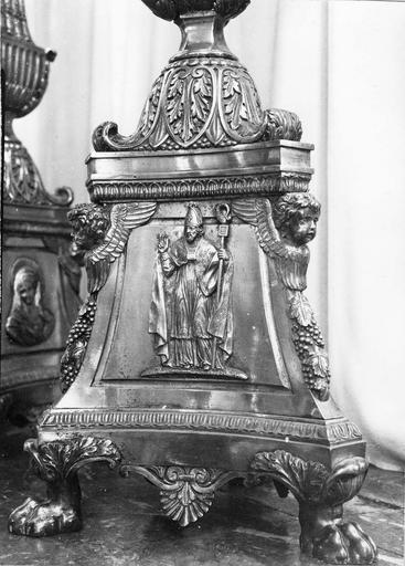 POP | Plateforme ouverte du patrimoinecrucifix, métal fondu et ciselé, détail du pied avec figure d'évêque, 19e siècle