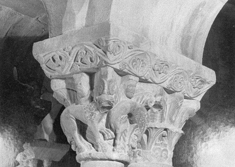 Cloître, intérieur : galerie sud, deuxième travée depuis l'ouest, chapiteaux géminés ornés de lionnes, figures humaines et motifs végétaux