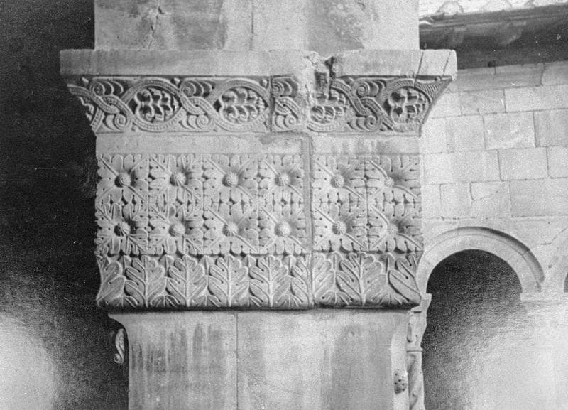 Cloître, intérieur : galerie sud, deuxième pilier depuis l'ouest, chapiteau orné de motifs floraux et géométriques