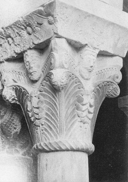 Cloître, intérieur : galerie sud, troisième travée depuis l'ouest, chapiteau orné de figures humaines et motifs végétaux