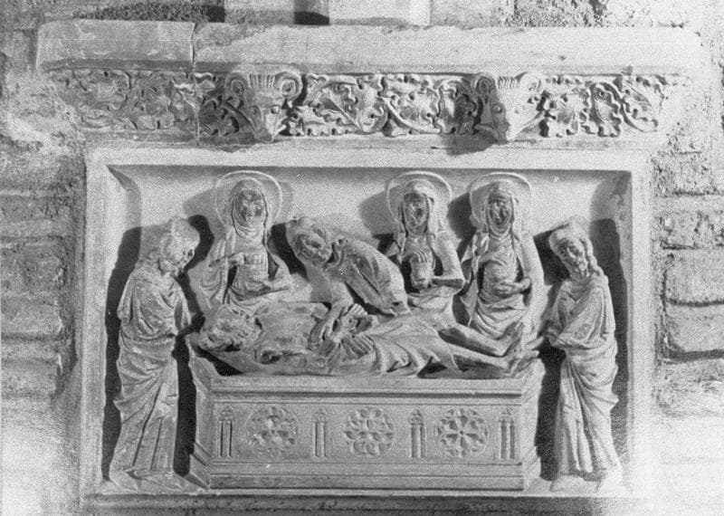 Cloître, intérieur : galerie sud, mur de la cinquième travée depuis l'ouest, retombée ornée d'un bas-relief représentant la Mise au tombeau