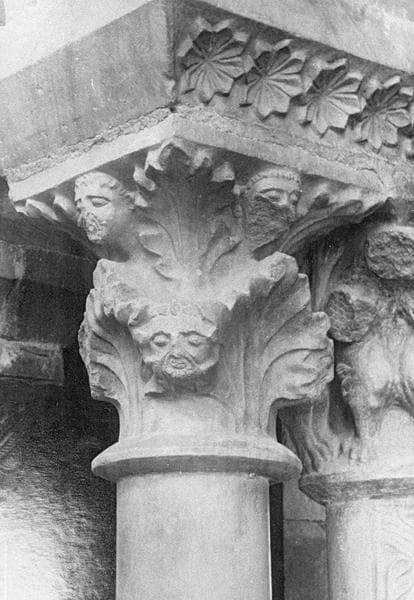 Cloître, intérieur : galerie nord, cinquième travée depuis l'est, détail d'un chapiteau orné de figures humaines et motifs végétaux
