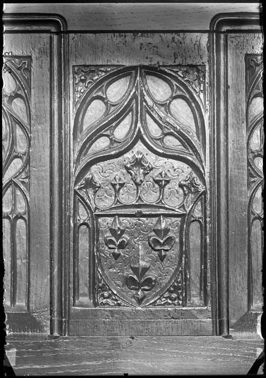 Banquette-coffre (n°2) à dossier et accotoirs en bois ciré, ornée d’anciens panneaux gothiques : détail d’un panneau