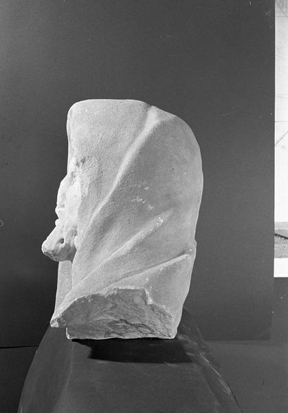 Statue en marbre blanc, fragment : tête de vieillard portant un capuchon, profil gauche