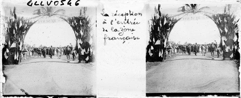 La réception à l'entrée de la zone française : arc de triomphe fait de feuillage