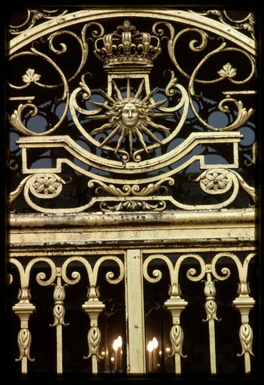 Cour de Marbre, grille, détail : Emblème du roi Soleil