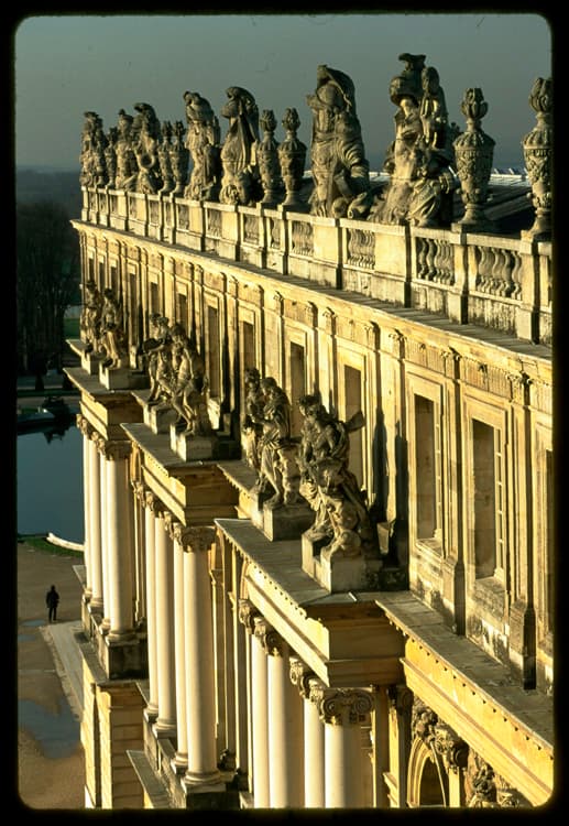 Façade ouest de l'aile centrale, depuis les toits ; Pots à feu