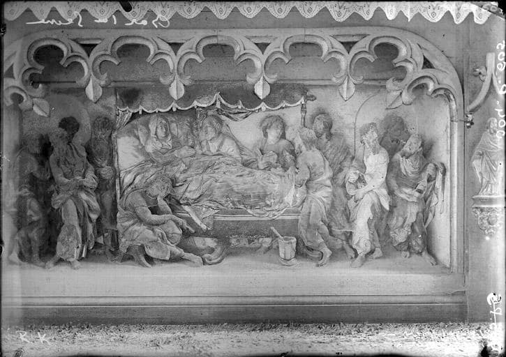 POP | Plateforme ouverte du patrimoineBas-relief historié encastré dans le mur du transept nord, pierre polychrome : La Mort de la Vierge