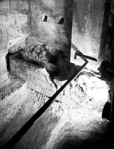 Crypte carolingienne : sarcophage formé d'éléments romains encastrés dans l'angle nord-ouest, vu depuis le puits