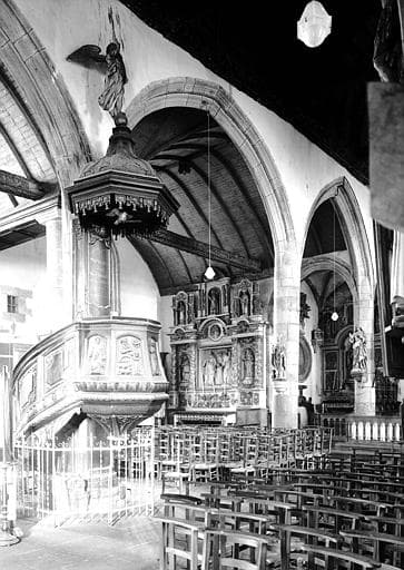 Chaire à prêcher en bois sculpté du 17e siècle et chapelles latérales nord