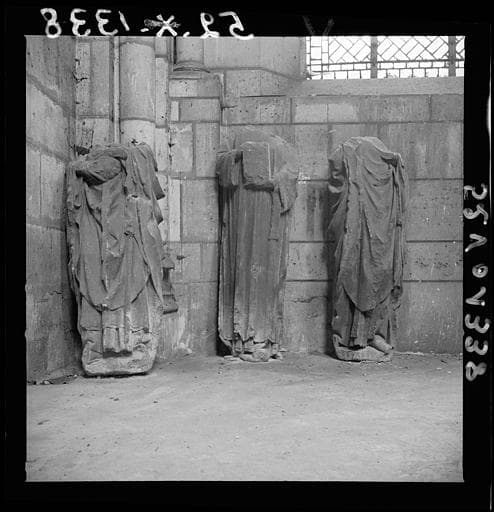 POP | Plateforme ouverte du patrimoineTrois statues mutilées en pierre (tête et bras manquants) provenant du portail Saint-Etienne : déposées dans la salle de la tour nord