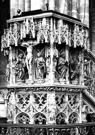 POP | Plateforme ouverte du patrimoineNef côté nord : chaire à prêcher, cuve en pierre sculptée
