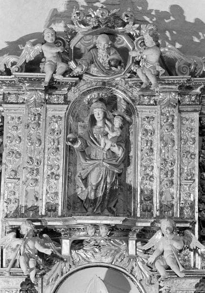 Retable du maître-autel, détail de la partie centrale supérieure : niche avec statue de la Vierge à l'Enfant surmontée d'un médaillon avec Dieu le père