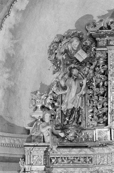 Retable du maître-autel, détail de la partie supérieure gauche : niche avec statue de saint François-Xavier surmontée d'un buste de saint Pierre