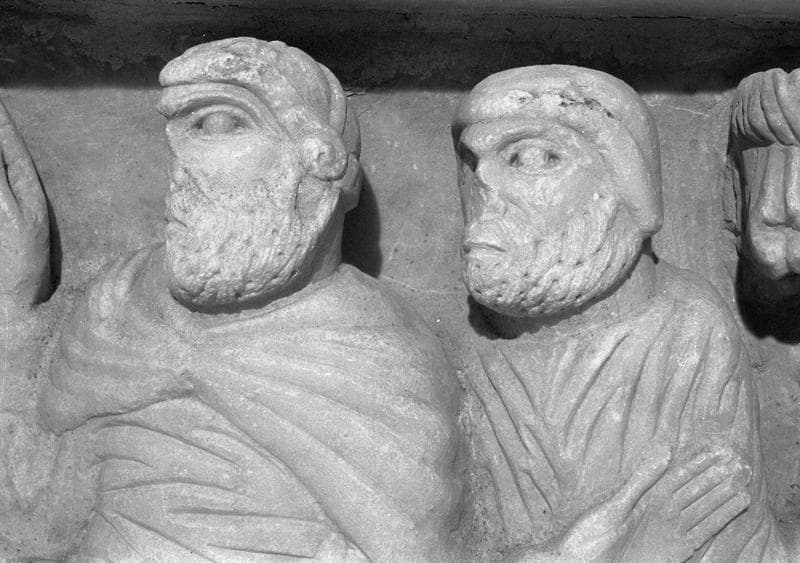 POP | Plateforme ouverte du patrimoineSarcophage servant d'autel, face avant côté droit : détail de la scène de l'arrestation de saint Sernin évangélisateur, deux têtes d'homme