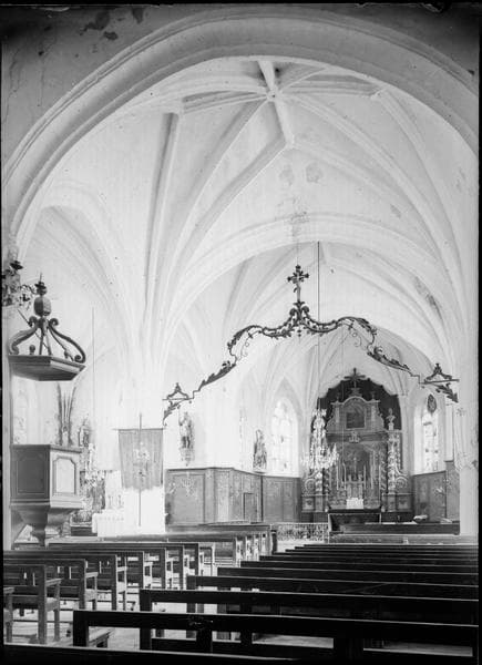 Intérieur : nef avec chaire à prêcher et poutre de gloire, vers le choeur