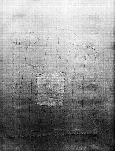 Tissu rouge : fragment d'un médaillon encadrant un bovidé et deux mains d'homme, envers