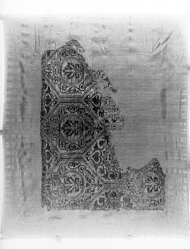 POP | Plateforme ouverte du patrimoineTissu bleu foncé et jaune, compartiments hexagonaux décorés de palmes et arabesques et masques