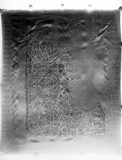 POP | Plateforme ouverte du patrimoineTissu bleu foncé et jaune, compartiments hexagonaux décorés de palmes et arabesques et masques
