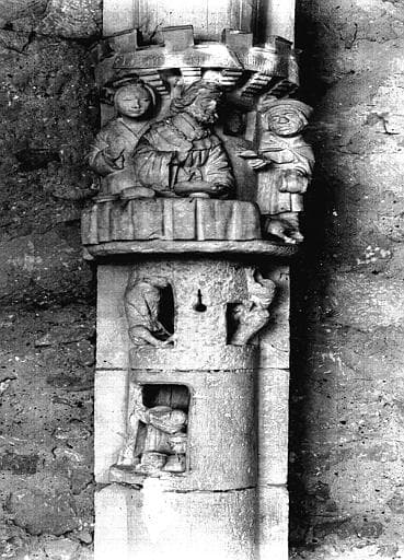 Cloître, galerie nord, retombée de voûte sur colonne à figures sculptées : Lazare et le mauvais riche