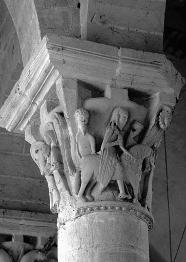 Intérieur, travée double, côté sud, chapiteau de la colonne médiane, angle sud-est : Lutte de Jacob et de l'ange, Départ de Jacob