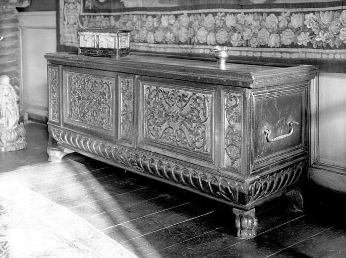 Salle des Consuls : coffre en bois sculpté orné d'arabesques et de godrons, pieds à griffes, époque Renaissance italienne