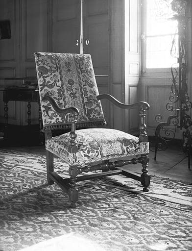 Salle des Consuls : fauteuil garni de tapisserie, époque Louis XIII