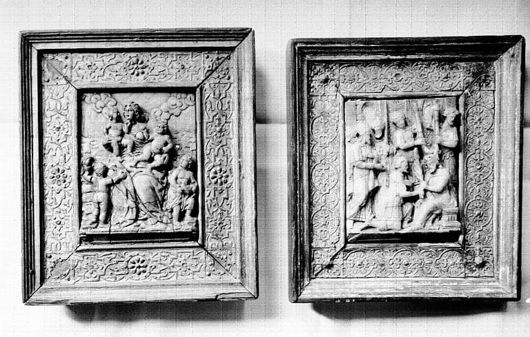 Salle des Consuls, deux petits albâtres italiens encadrés de bois doré : sainte Famille, Couronnement d'épines, salle des Consuls