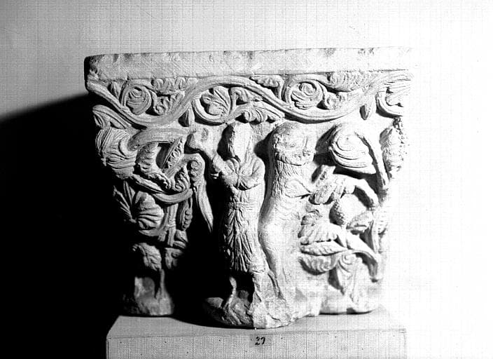 POP | Plateforme ouverte du patrimoineChapiteau triple engagé en pierre provenant de l'abbaye : homme assommant un fauve