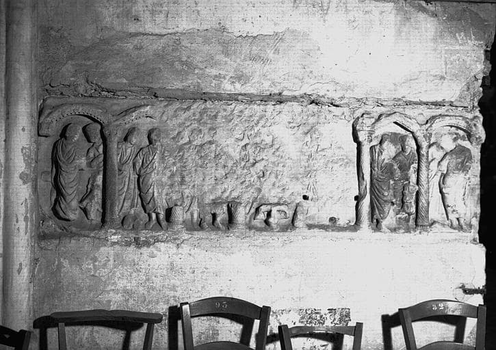 POP | Plateforme ouverte du patrimoineDevant de sarcophage en pierre encastré sous la tribune