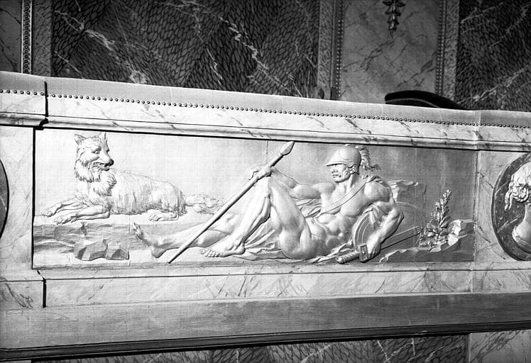 Salle, premières loges, un bas-relief de Pajau : guerrier et loup
