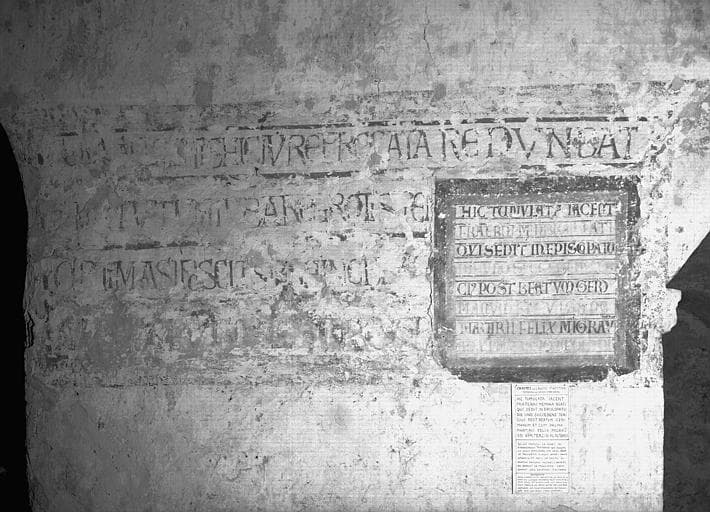 POP | Plateforme ouverte du patrimoineCrypte, déambulatoire, mur ouest : inscription à senestre de l'ouverture sur la Confession