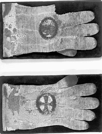 POP | Plateforme ouverte du patrimoineGants épiscopaux en soie blanche tricotée et plaques circulaires d'argent ciselé et doré, état après restauration